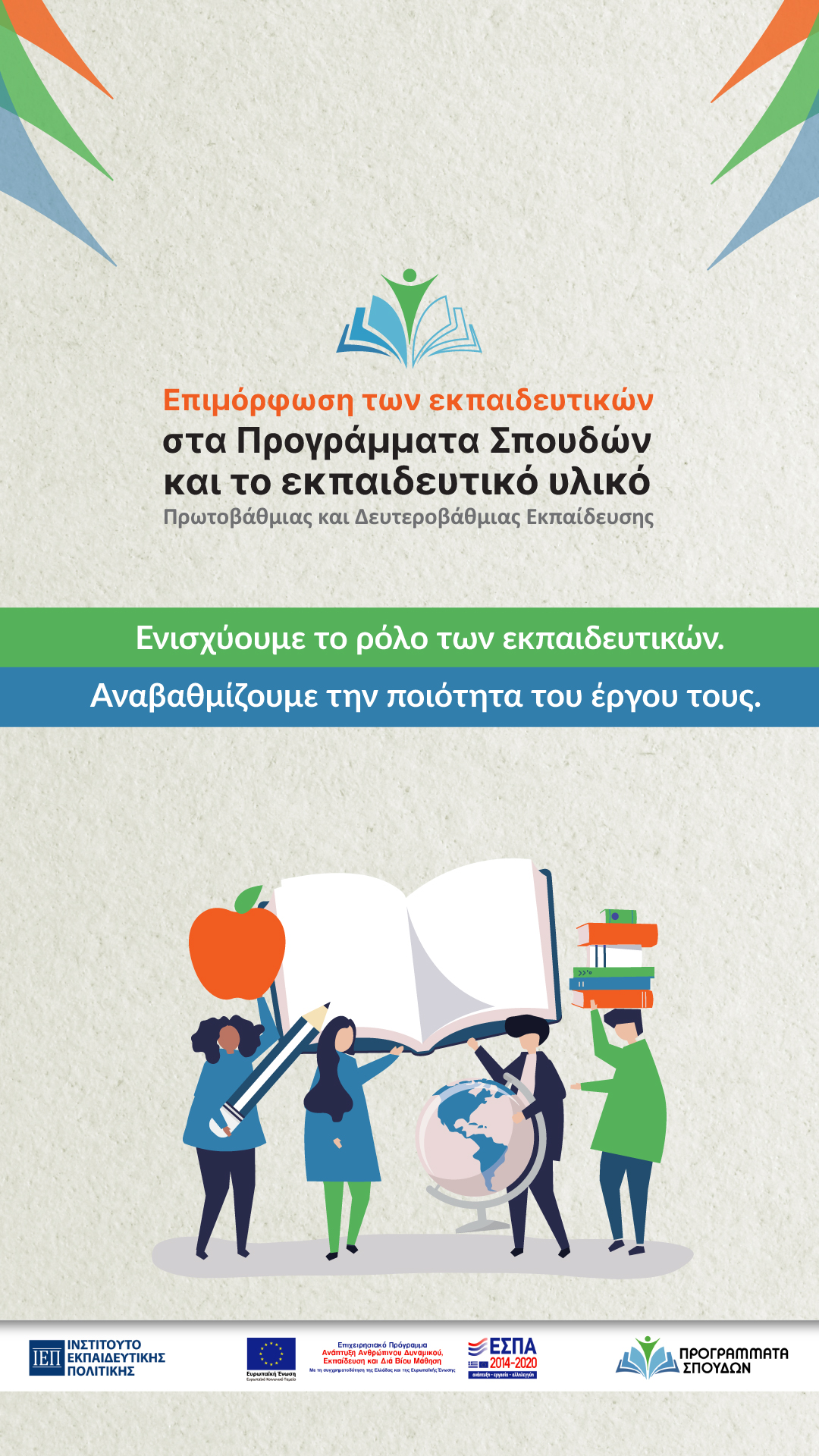 Η Πράξη «Επιμόρφωση των εκπαιδευτικών στα Προγράμματα Σπουδών και το Εκπαιδευτικό Υλικό Πρωτοβάθμιας και Δευτεροβάθμιας Εκπαίδευσης» έχει ως αντικείμενο: α) την εκπόνηση επιμορφωτικού υλικού επί των νέων Προγραμμάτων Σπουδών και του αντίστοιχου υποστηρικτικού υλικού των γνωστικών πεδίων της Πρωτοβάθμιας και της Δευτεροβάθμιας Εκπαίδευσης (συμπεριλαμβανομένων των μαθημάτων Μουσικής και Καλλιτεχνικής Παιδείας των Μουσικών και Καλλιτεχνικών Σχολείων) καθώς και τον σχεδιασμό και την πραγματοποίηση επιμορφωτικών δράσεων επ' αυτών για τους/τις εκπαιδευτικούς της πρωτοβάθμιας και της δευτεροβάθμιας εκπαίδευσης και β) την υλοποίηση επιμόρφωσης για τη διδασκαλία της ελληνικής ως δεύτερης γλώσσας.